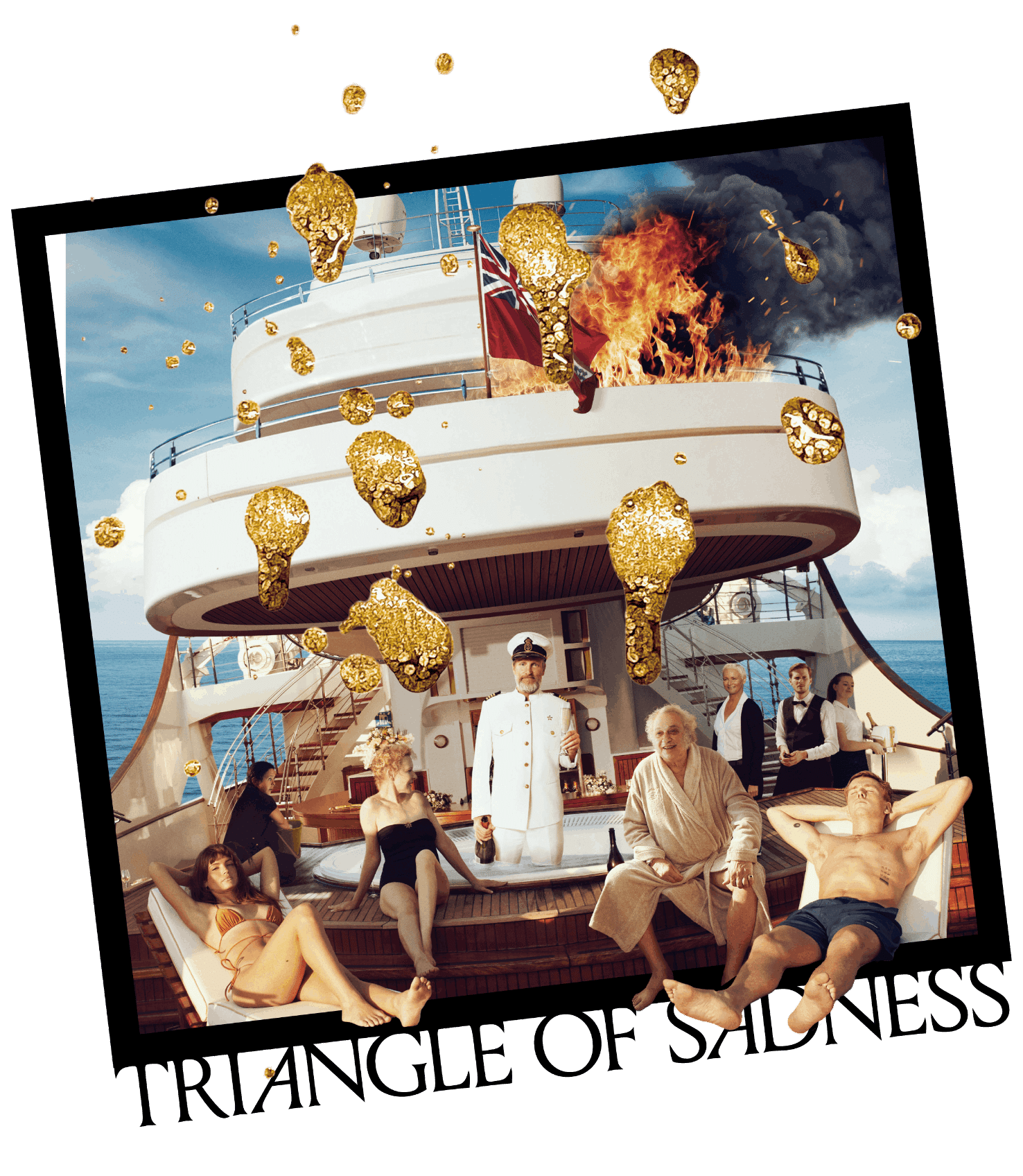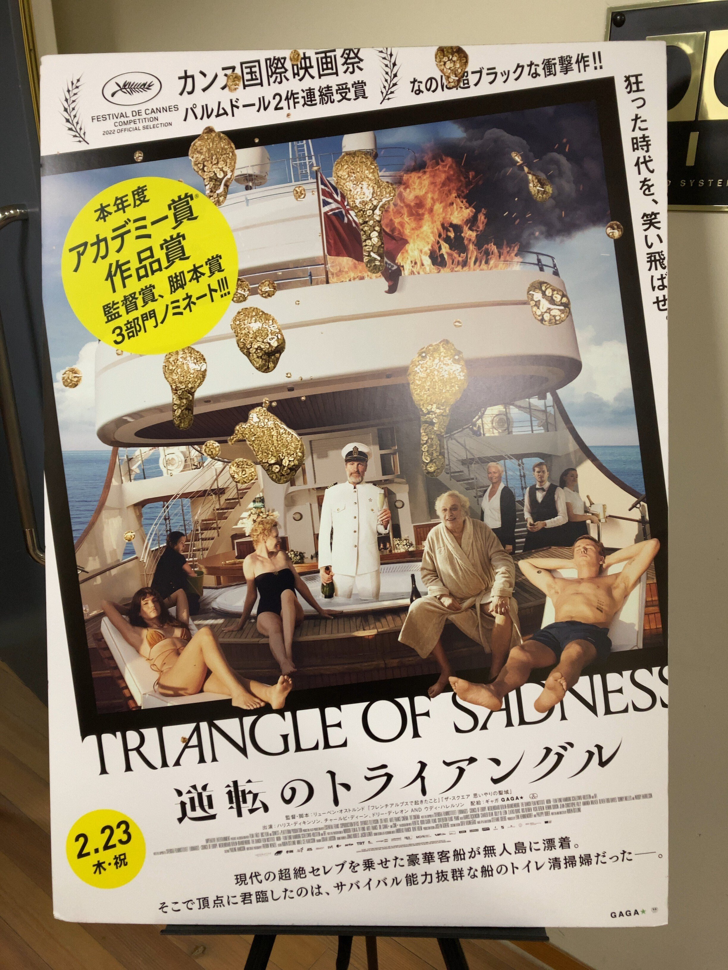 事態はそれに留まらず、揺れで下水は吹き返し、船内はウンコゲロまみれになっていく。そして船内は完全に指揮系統が崩壊してしまい、酔い潰れた金持ちがふざけて「まもなく沈没します。運命を受け入れろ!」と船内放送を始め、金持ちたちは救命胴衣を装着し深刻な表情で只々動けなくなる。この辺りは氏の監督作でも最も最悪でバカバカしいスペクタクルに溢れた場面となっている。